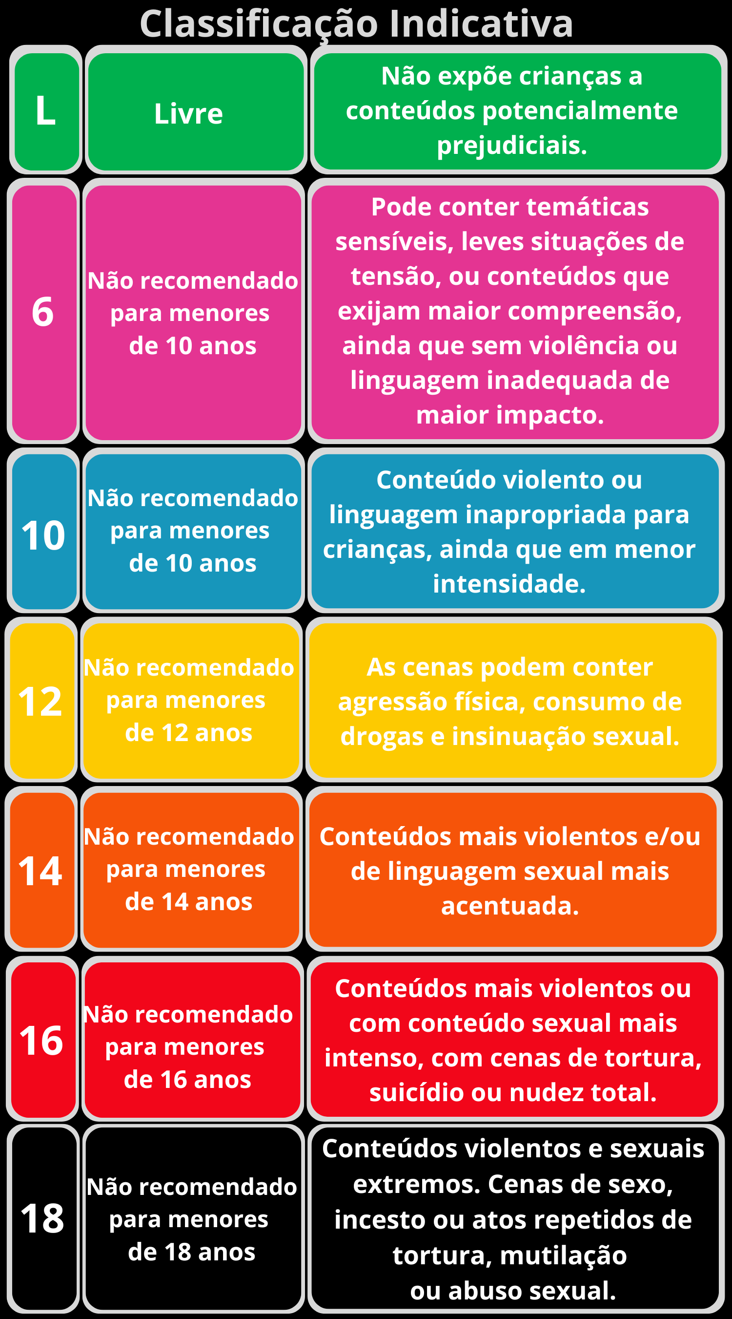 A classificação indicativa dos filmes é realizada de acordo com as disposições da Constituição Federal, do Estatuto da Criança e do Adolescente, da Portaria Nº 502, de 23/11/2021 do Ministério da Justiça.